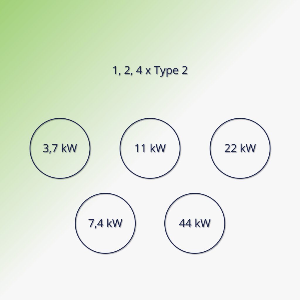 Cu una, două sau patru prize antivandal sau cabluri de încărcare atașate cu conector Type 2 în curent alternativ monofazic sau trifazic, echipată cu DC Leakage Detector, cu o putere configurabilă de 3,7 kW, 7,4 kW, 11 kW, 22 kW sau cu încărcare rapidă 44 kW permite achiziția modelului optim pentru orice situație.